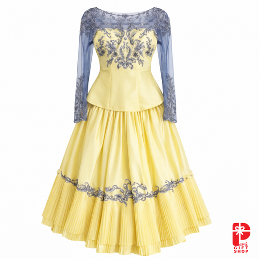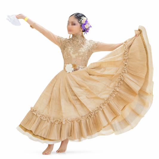 3 Piece - Marinera Norteña Couture Heritage Dress – Iberian Colonial Grandeur - Champagne Lace & Structured Pleated Skirt