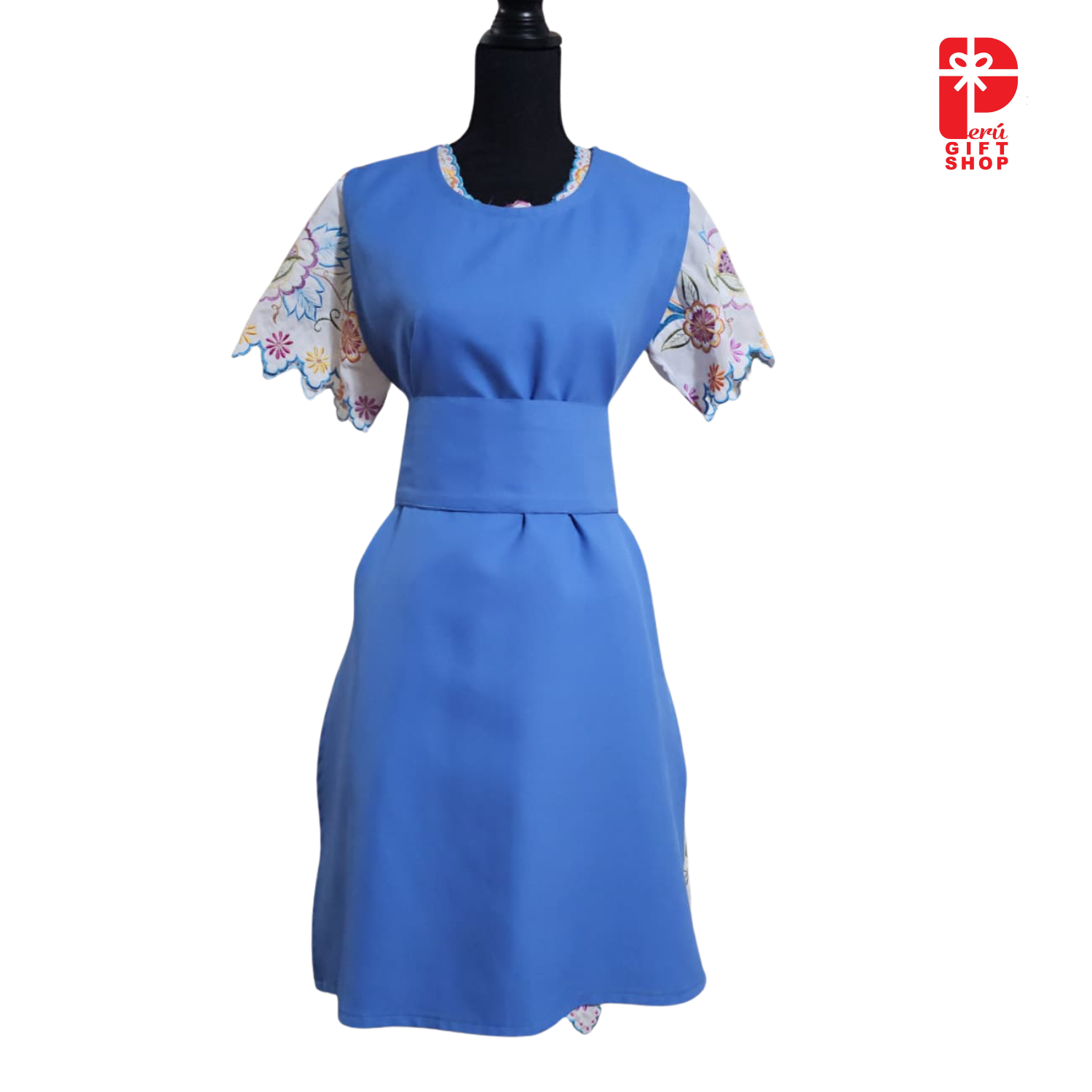 This Light Blue Anaco de Colán inspired dress reflects the distinctive heritage of Caleta de Colán in Piura. The anaco, a garment of pre-Hispanic origin adapted over centuries, remains a symbol of coastal continuity and local identity within northern Peru.