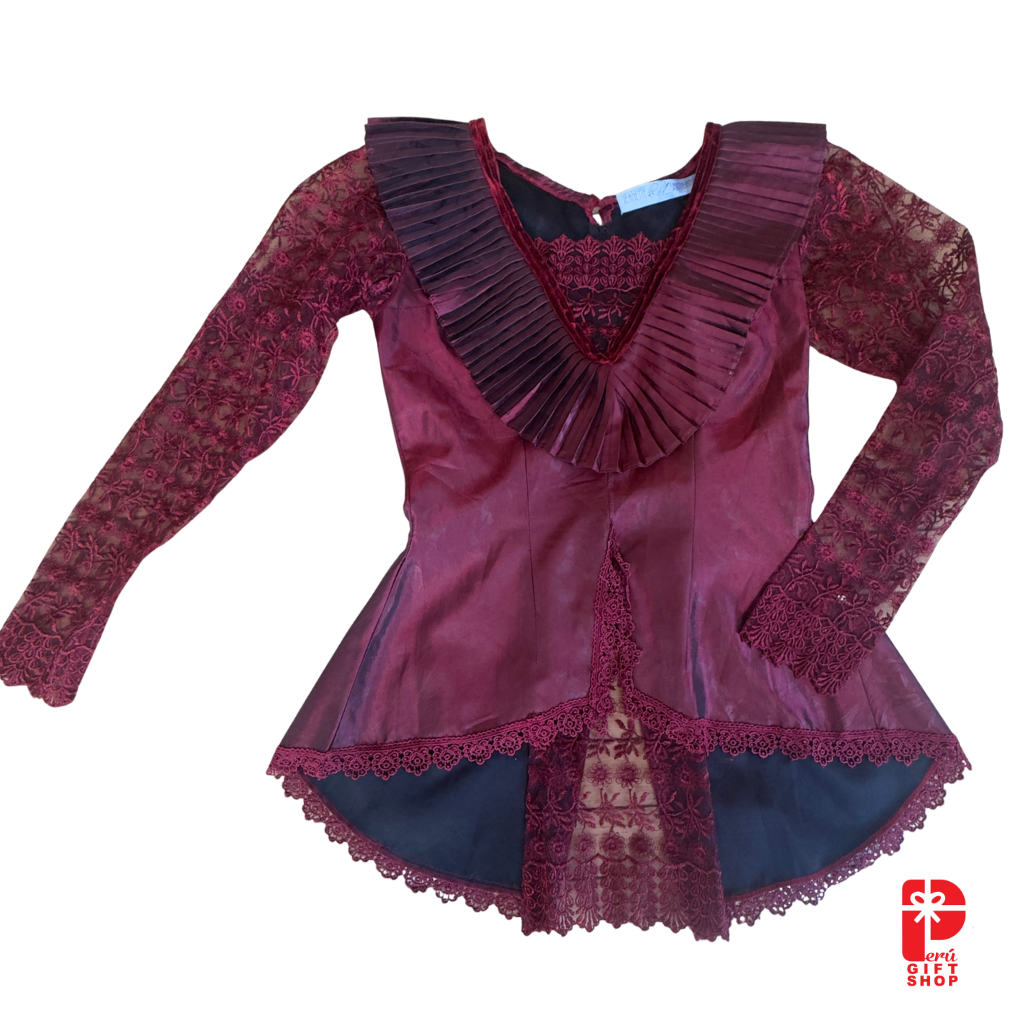 This Marinera Norteña dance dress reflects a structured interpretation of coastal Peruvian identity, where colonial influence and performance tradition converge. The burgundy palette, combined with layered pleating and lace sleeves, introduces a visual language rooted in historical adaptation and formal elegance.